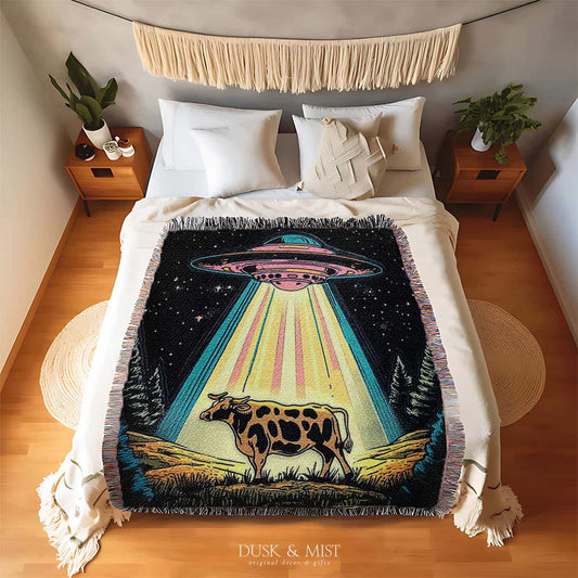 Retro UFO Cow Rainbow Beam Throw Blanket