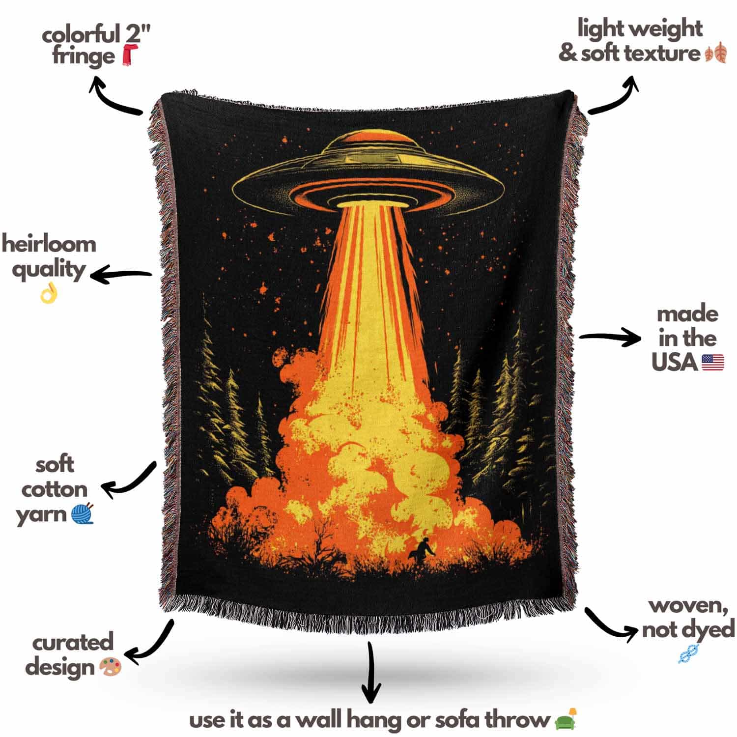 Woven cotton blanket featuring a UFO with a fiery orange beam blasting into a forest, with smoke clouds and a small human silhouette running at the bottom.