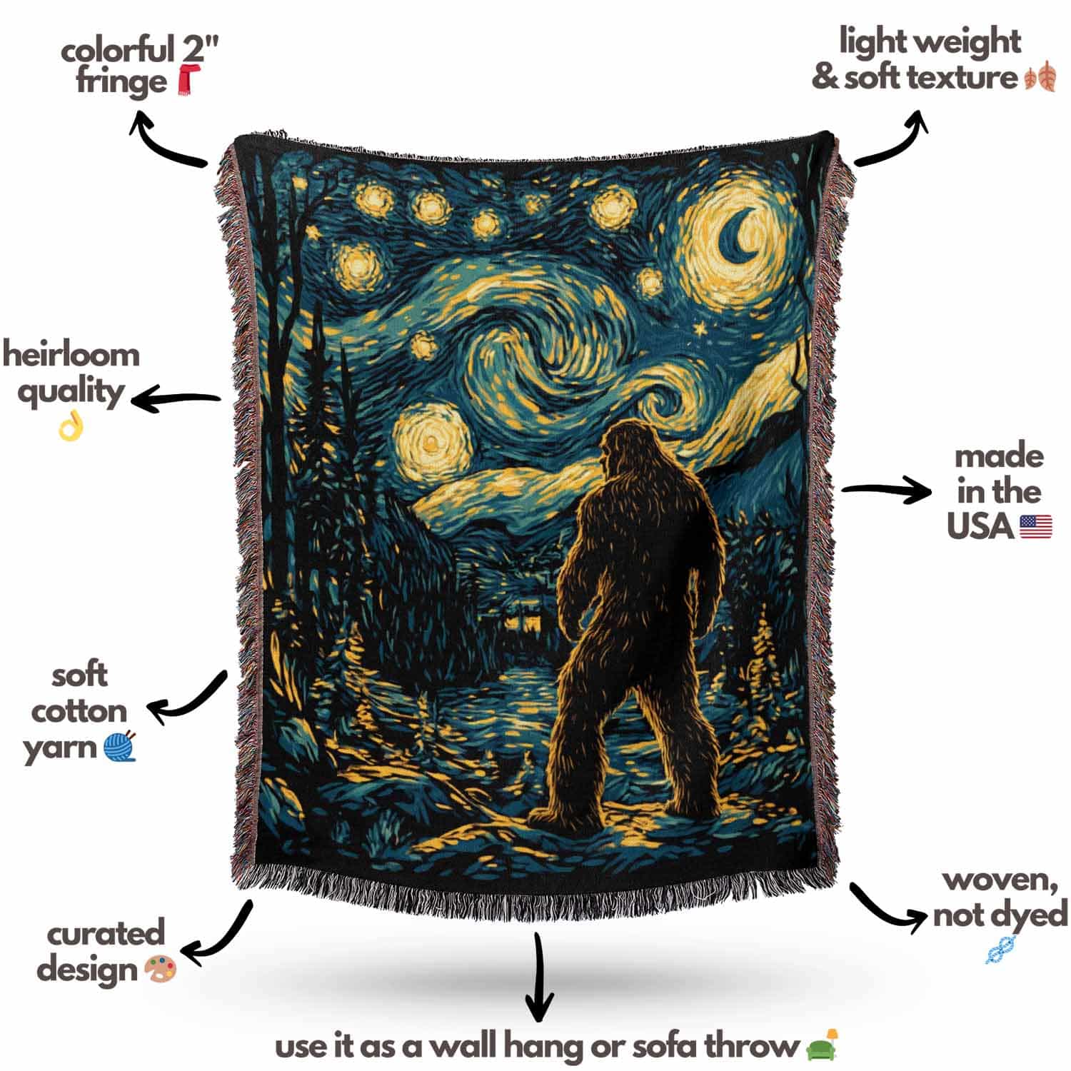 Woven cotton blanket featuring Bigfoot in a forest beneath a Van Gogh-style starry night sky with swirling constellations and moonlight.