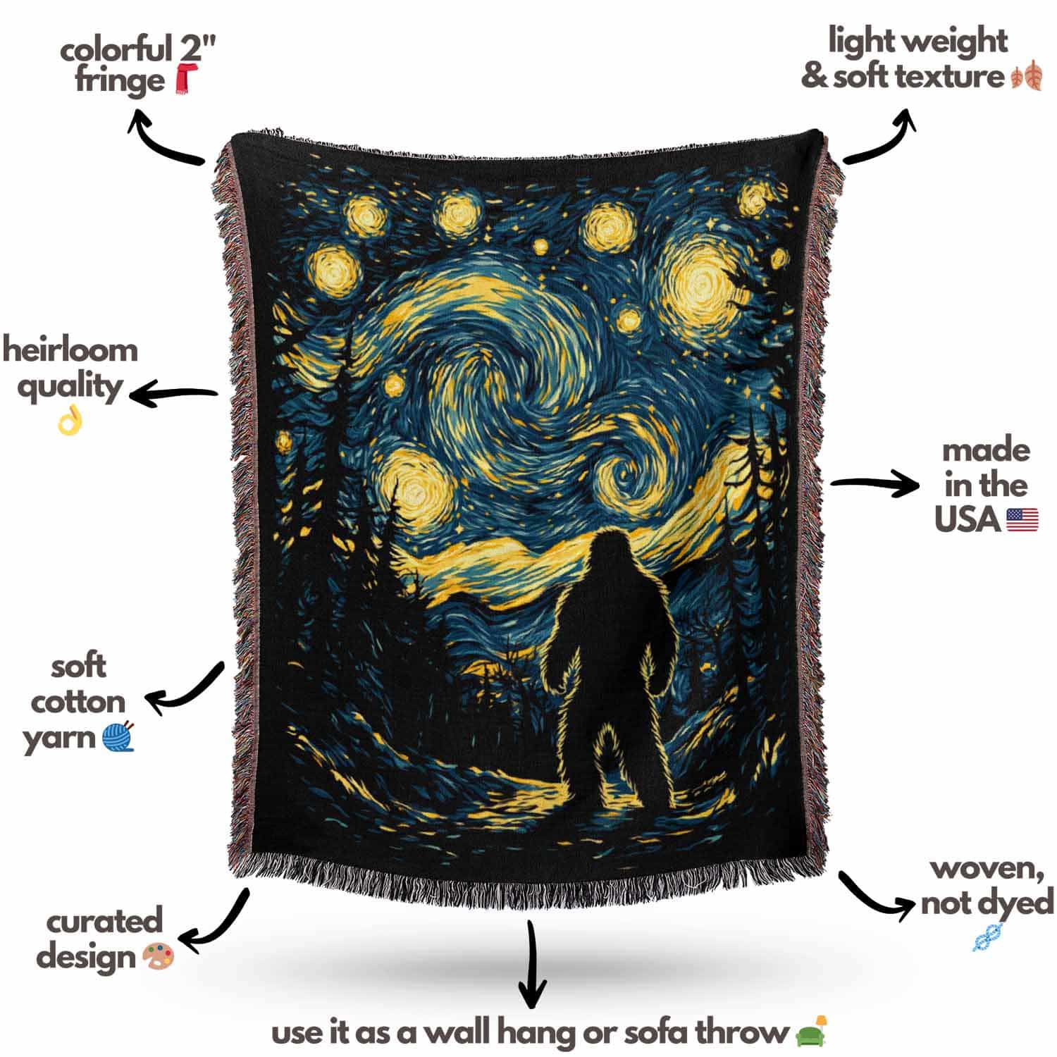 Woven cotton blanket featuring Bigfoot in silhouette against a Van Gogh-style starry night sky with swirling golden stars and dark forest trees.