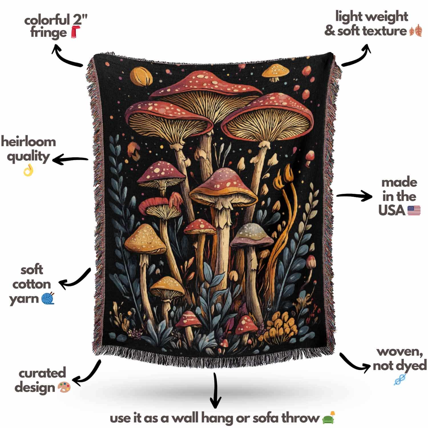 Woven cotton blanket featuring a botanical-style cluster of mushrooms in red, gold, and purple caps surrounded by plants and foliage on a black background.