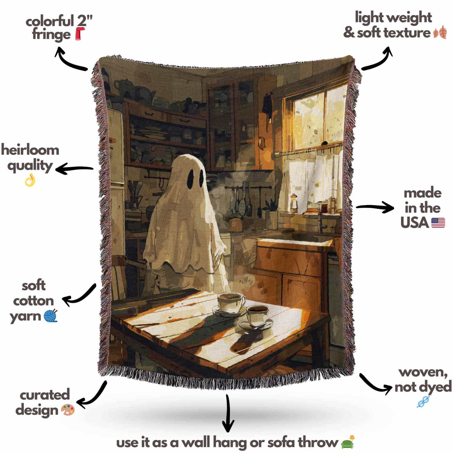 Woven cotton blanket depicting a ghost standing in a vintage kitchen with sunlight streaming through the window onto a wooden table with two teacups.
