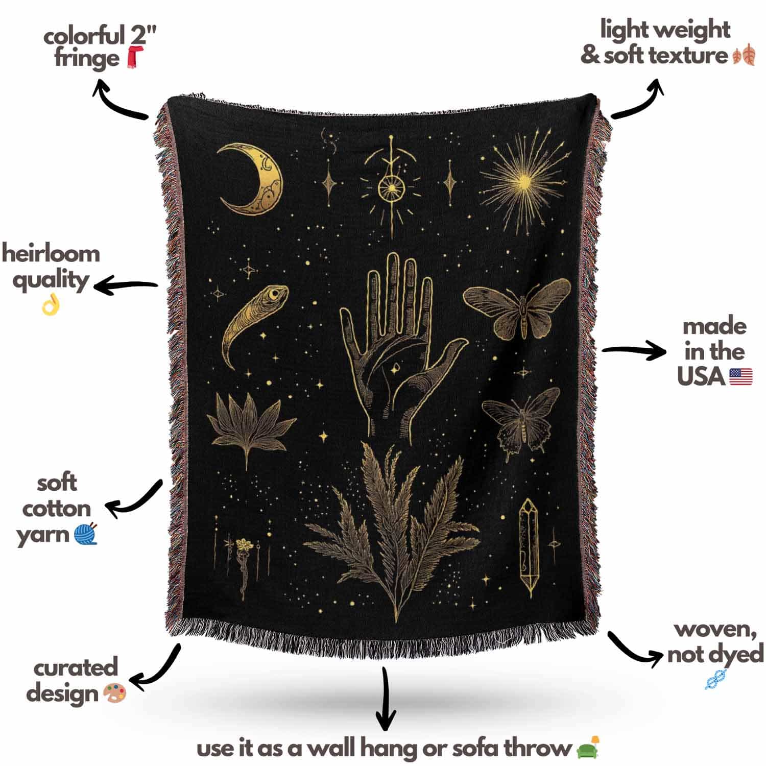 Woven cotton blanket with golden occult illustrations — palmistry hand, crescent moon, moth, snake, crystals, plants, and celestial symbols on a black background.