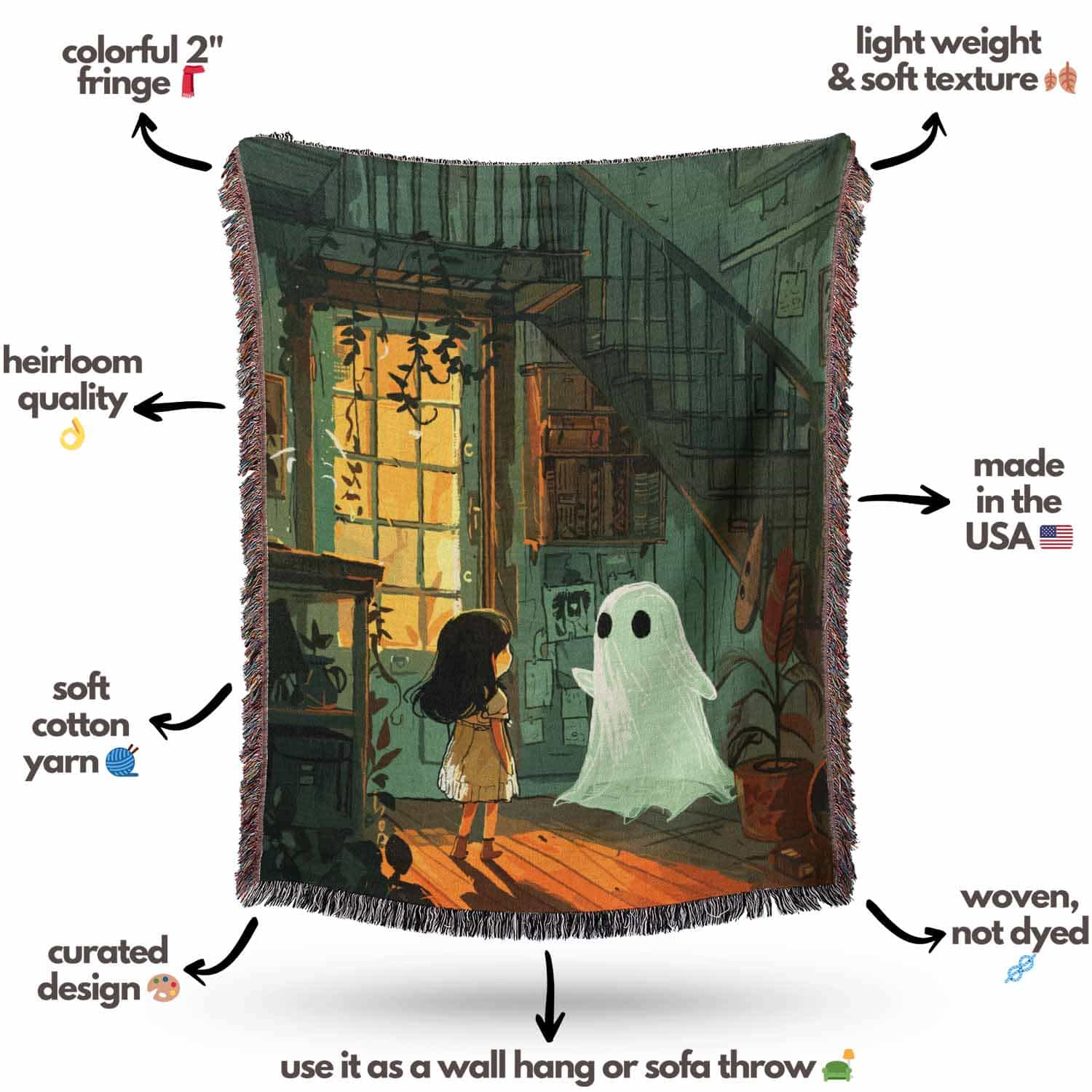 Woven cotton blanket depicting a small ghost and a young girl standing in a warmly lit wooden room filled with plants, books, and soft evening light streaming through a door.
