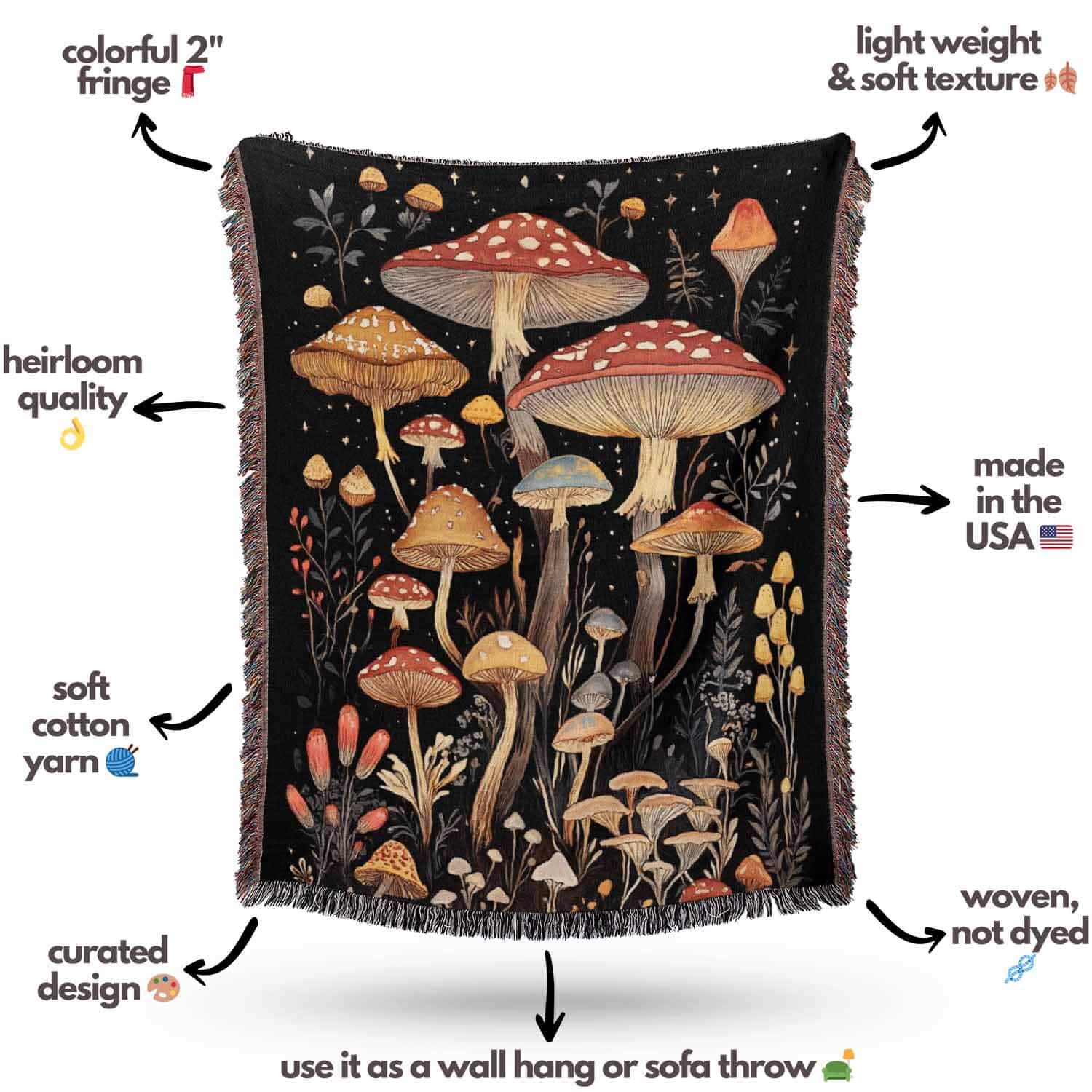 Woven cotton blanket showing a colorful cluster of mushrooms in red, gold, blue, and cream caps with surrounding plants and flowers on a black background.