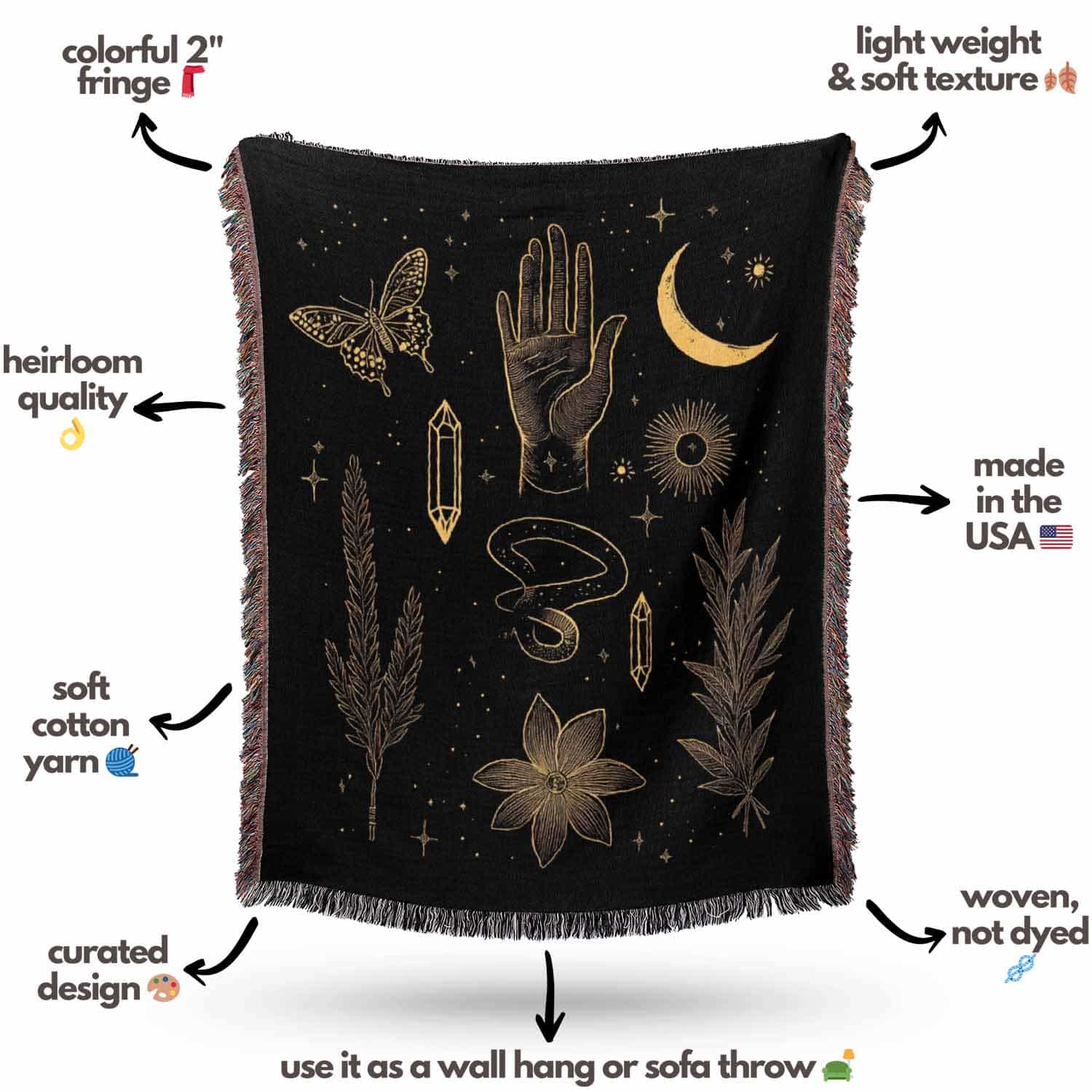 This jacquard-woven throw channels arcane energy with its golden palmistry hand, serpent, lunar crescent, and mystical botanicals — all set against a rich black backdrop. Perfect as a wall tapestry or moody bed accent, it’s designed for seekers, stargazers, and anyone who walks between the seen and unseen.