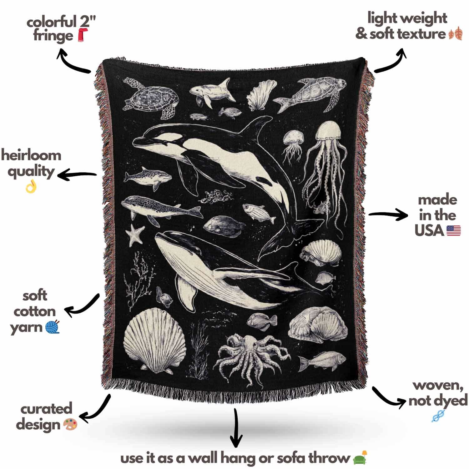 Woven cotton blanket featuring detailed ocean life illustration — whales, orca, turtles, jellyfish, octopus, seashells, fish, and coral on a black background.