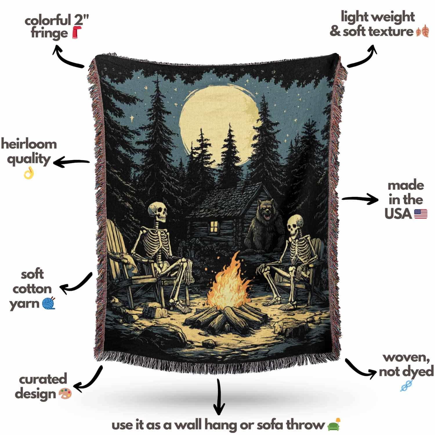 Woven cotton blanket depicting two skeletons seated by a campfire in a forest clearing with a log cabin, full moon, and bear in the background.