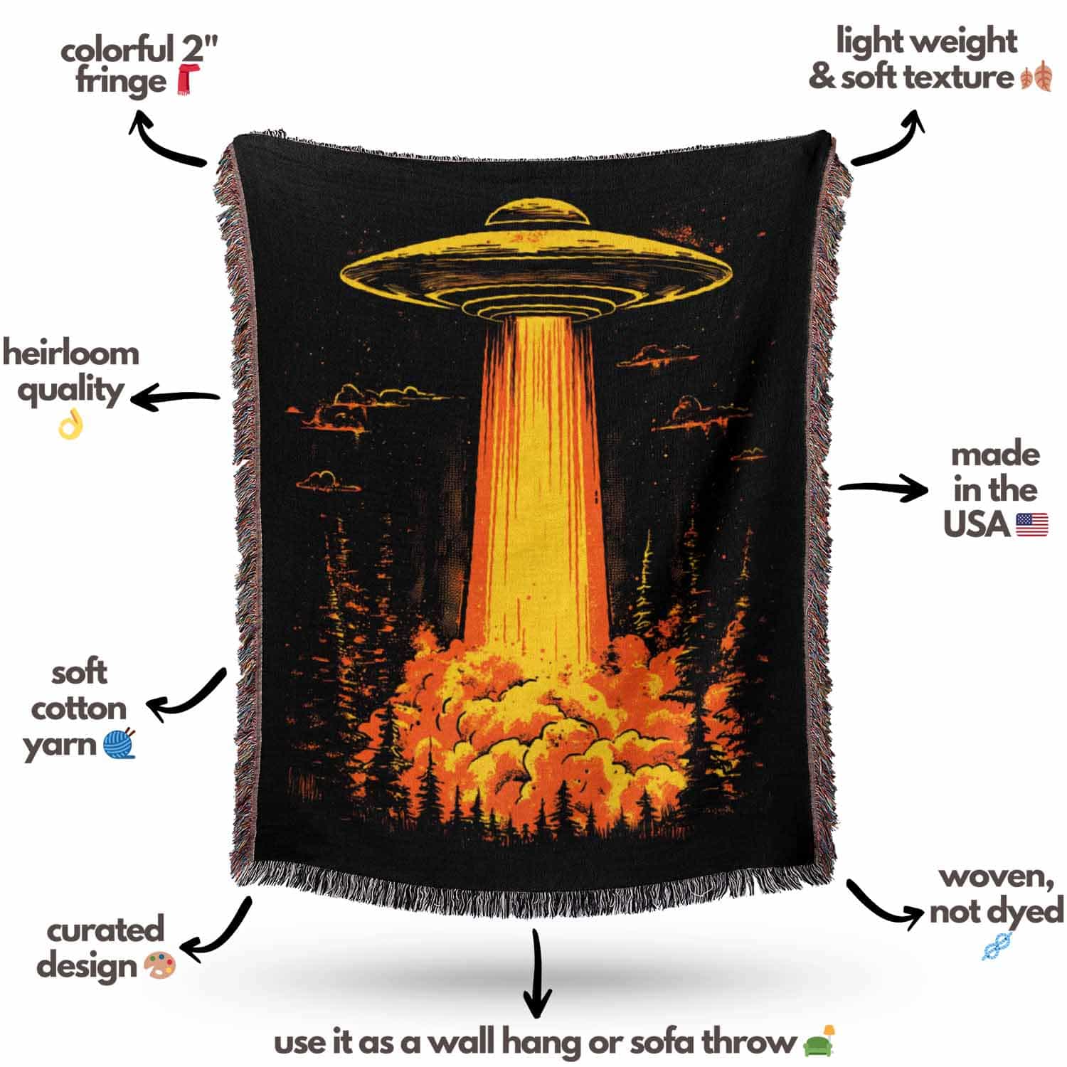 A blazing UFO lights the forest in fiery orange, its beam cutting through the night sky. This woven blanket captures the thrill of cosmic encounters, perfect for sci-fi dreamers, alien enthusiasts, and anyone who loves a touch of mystery in their home decor.