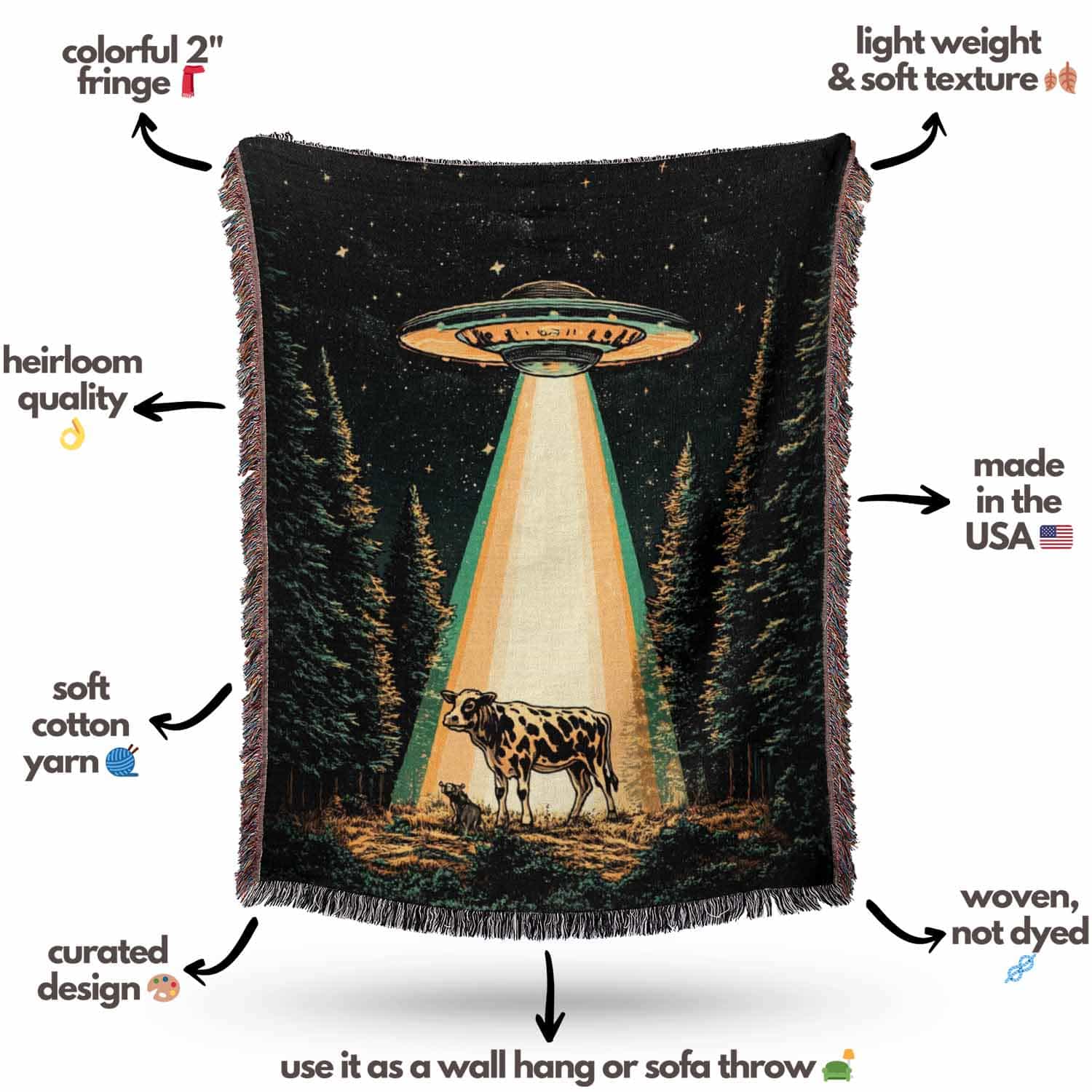 Woven cotton blanket showing a UFO shining a beam of light onto a cow in a forest clearing under a starry night sky.